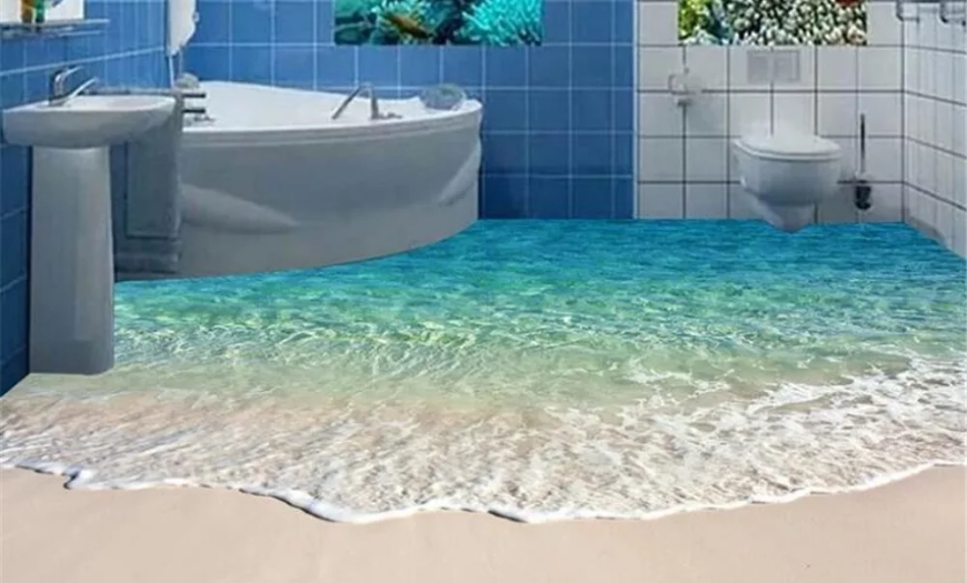 Мураль представляет собой большое фотоизображение на всю стену в ванной.