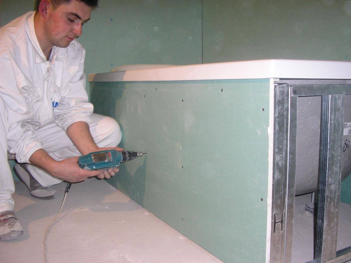 Выравнивание стен ванны гипсокартоном позволяет намного быстрее сделать обшивку. Ведь не нужно тратить время на предварительную сборку каркаса. Для этого потребуется влагостойкий гипсокартон в необходимом количестве, а также монтажный клей для гипсокартона «Перлфикс». Работа ведется по следующему алгоритму.