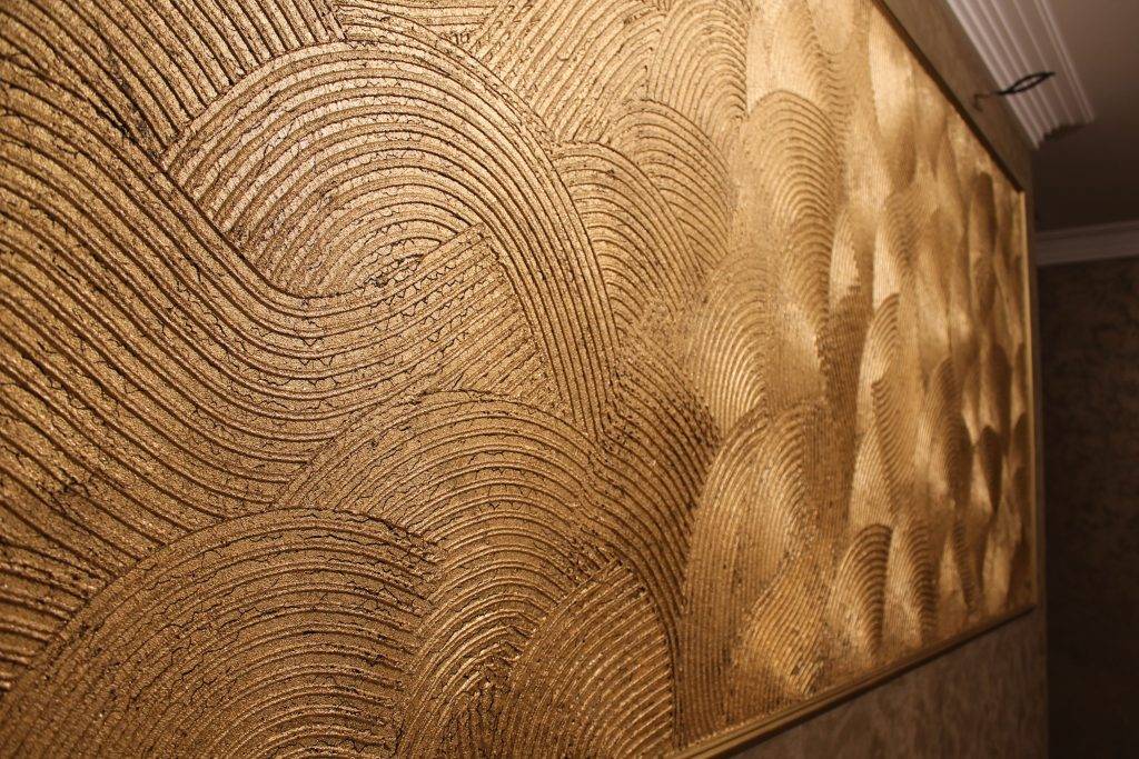 - Штукатурка с видом «мокрого шелка». В фактуре отмечается наличие перламутровых частиц. По внешнему виду напоминает текстиль.