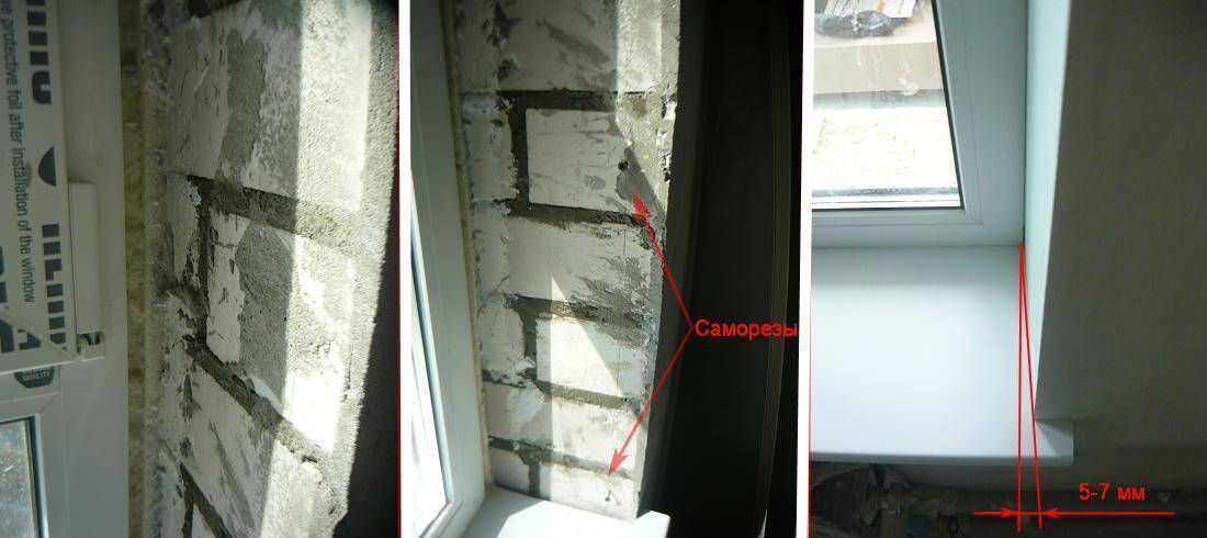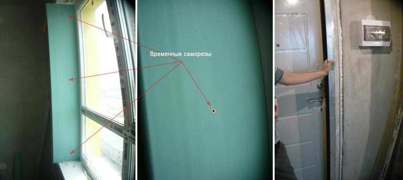 В пенном шве окна|двери прорезается углубление 1-1,5 см в толщину гипсокартона. Лист должен впритирку входить в этот паз. Ближе к внутреннему краю стены вкручиваются маячковые саморезы с расстоянием 30-50 см друг от друга, чем чаще, тем лучше. На саморезы будет опираться откос, их следует выставить так, чтобы лист был не перпендикулярен окну, а был развернут на “рассвет”. Величина разворота произвольная, как больше нравится, обычно делается 5-7 мм для тонких панельных стен (кирпичная кладка в монолите) и 1,5-2 см для толстых кирпичных.