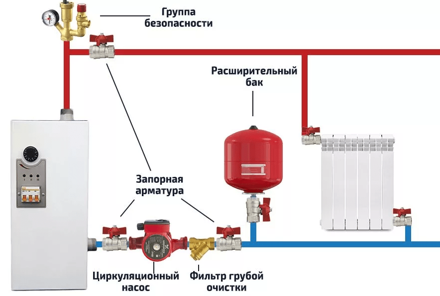 Это отопительная конструкция, в которой циркуляция теплоносителя по трубам осуществляется принудительно с помощью специального насоса, а для его работы требуется подключение к электросети. Принцип работы закрытой установки практически не отличается от открытой: