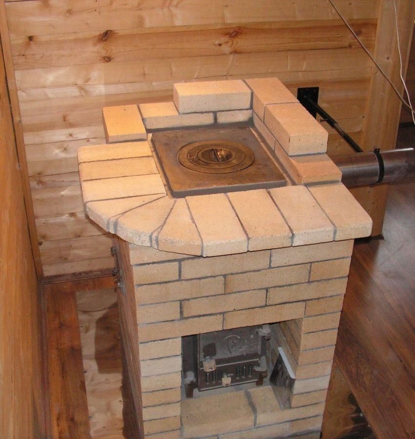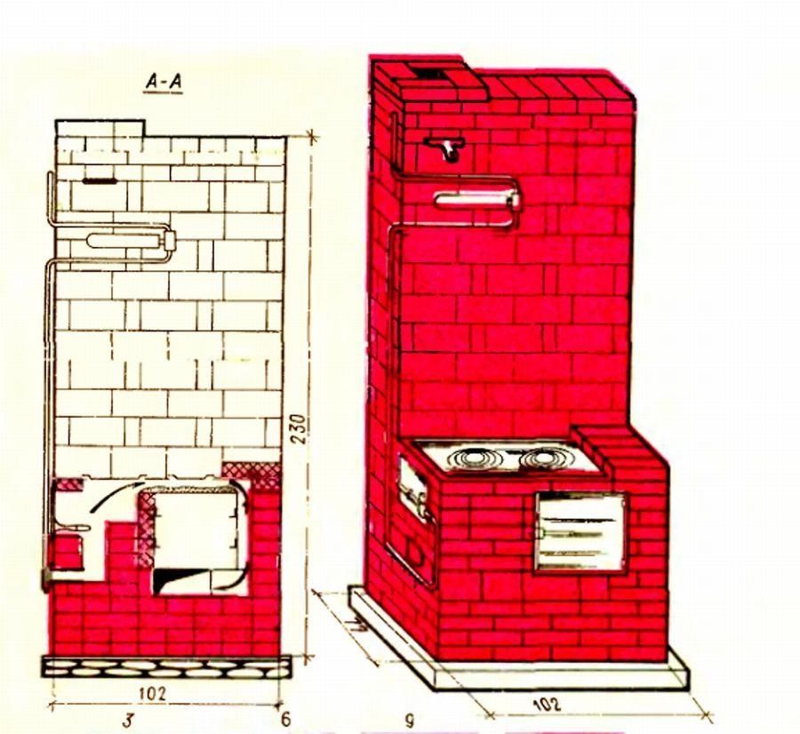 В малогабаритную печь для отопления встраивают нишу, где располагают варочную плоскость. Во вторую нишу помещают духовку или емкость для подогрева воды. Печь-плита из кирпича используется для сушки продуктов, одежды.