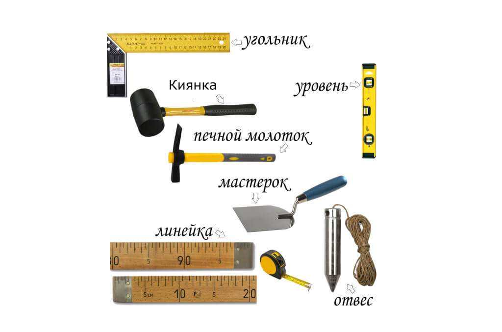 Для возведения печки подготовьте инструментарий, изображенный на фото. Бетонное основание должно затвердеть в течение 28 суток после заливки, затем его укрывают гидроизоляцией из рубероида (2 слоя) и базальтовым картоном.