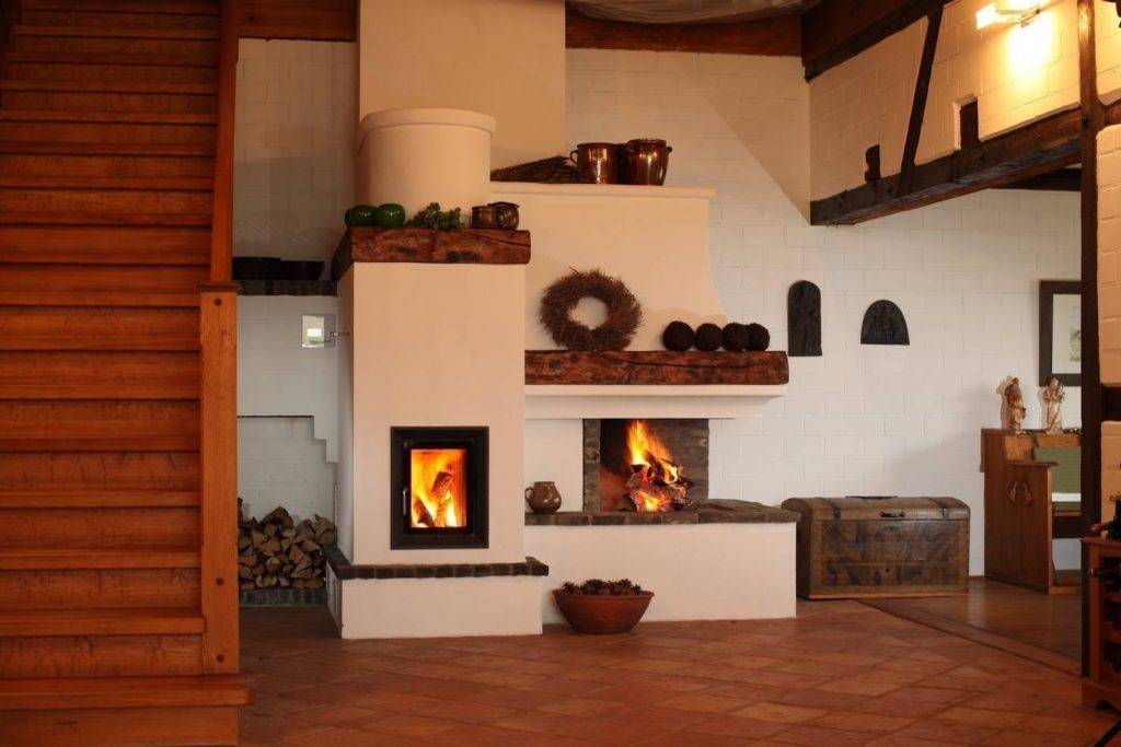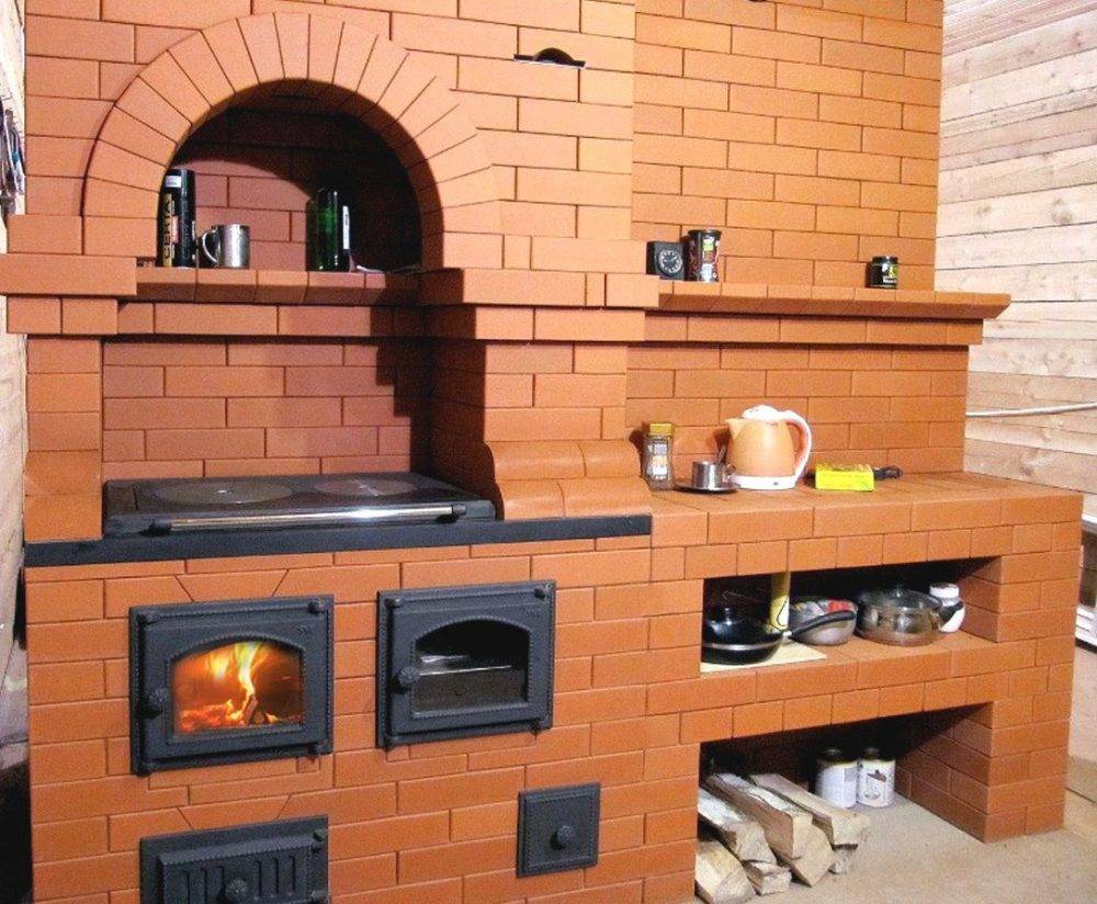Часто отопительное устройство с лицевой или оборотной стороны оснащают камином (то есть он будет заложен либо в кухне, либо в гостиной). Дымоход может быть объединенным или раздельным. В первом случае образуется единая конструкция, ее легче собрать, материала нужно немного. Но топить можно будет либо печь, либо камин. Раздельные дымоходы не столь экономичны при возведении, но они позволяют одновременно использовать оба способа отопления.