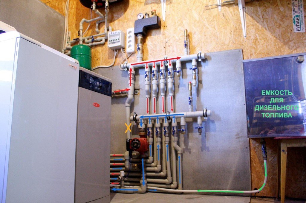 Прочие моменты такие же, как при обустройстве стандартной системы отопления, – устанавливается компенсационный (расширительный) бак, насос циркуляционный, группа безопасности. Удобнее всего размещать дополнительные элементы схемы в одном месте, в котельной, где установлен сам котел на дизельном топливе.
