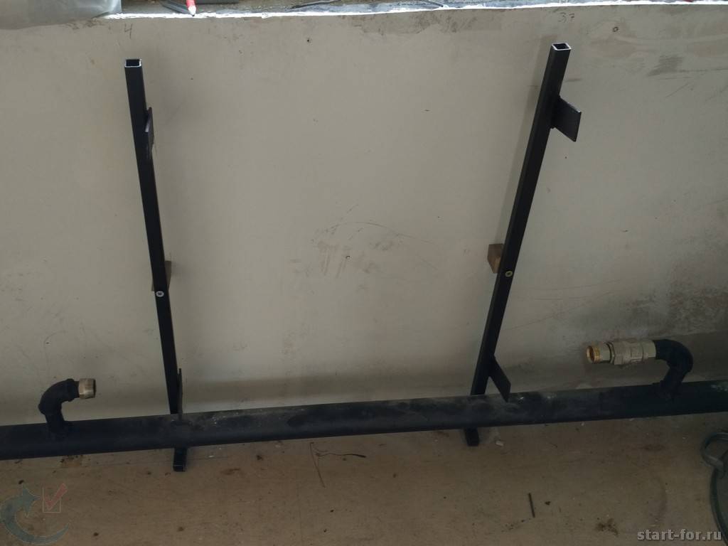 Когда закончил с трубой принялся за подключение радиаторов отопления. Предварительно собирал на сухую радиаторы, навешивал их на крепления и отмечал места под отверстия для отводов.