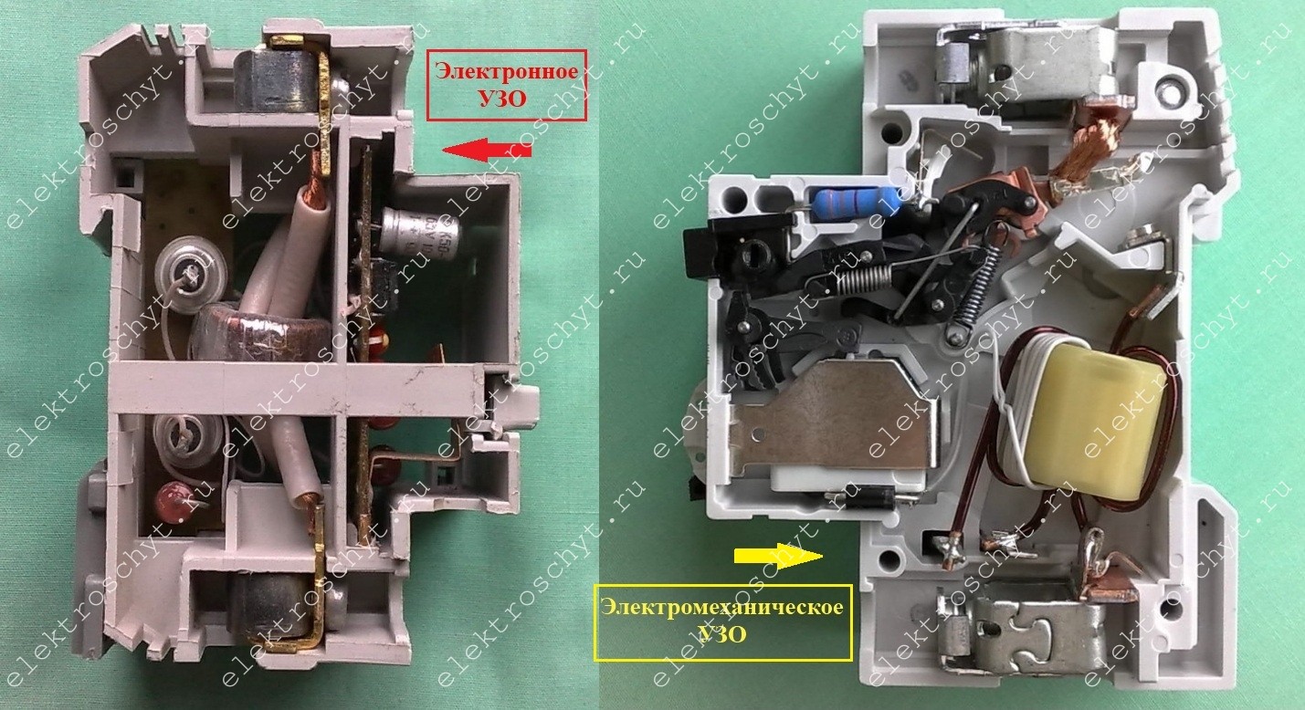 По этим схемам можно определить, электронное УЗО или электромеханическое, схемы наносят на корпуса УЗО.