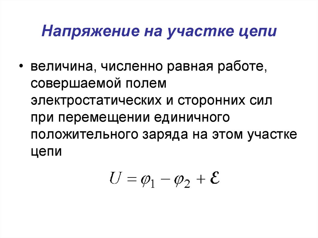 | Базовый расчёт напряжения на участке цепи | U=I/R, где I — сила тока в Амперах, а R — сопротивление в Омах |