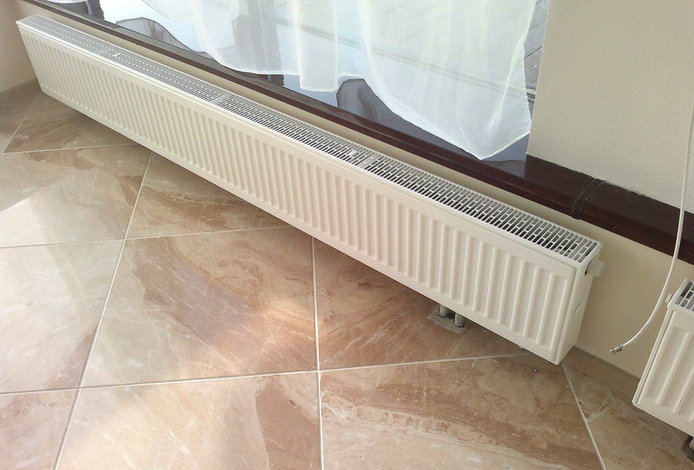 Трубчатые стальные батареи могут иметь еще более компактную конструкцию высотой от 155 мм, более стильный внешний вид. Глубина варьируется в пределах от 50 до 250 мм. Наряду с навесными аналогами находят применение низкие водяные напольные радиаторы отопления.