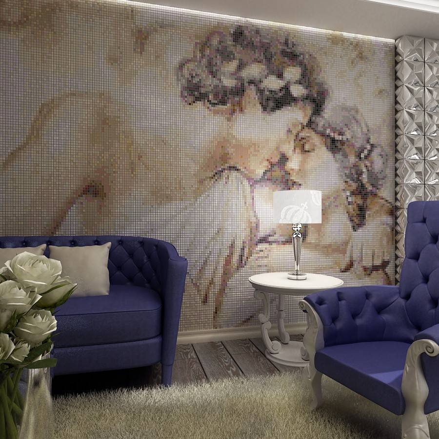 В гостиной комнате мозаичное решение предполагает различные варианты: и в виде панно, и даже целой стены