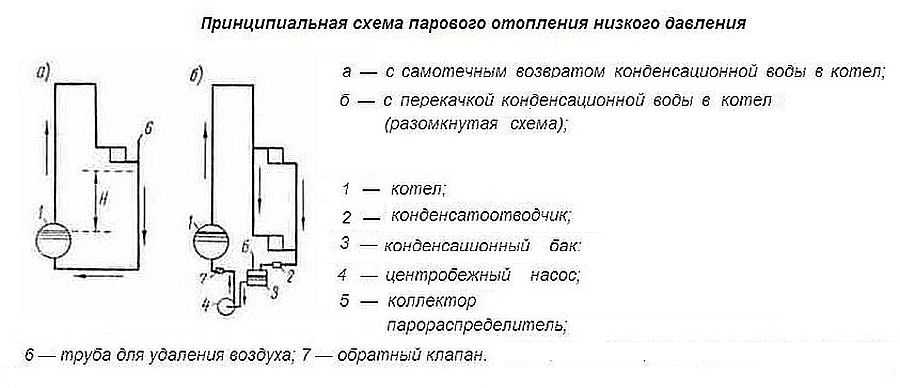 При монтаже используют открытую схему, при которой обустраивают бак для конденсата и насос, который нагнетает его из бака в котёл. Данный вид парового отопления устанавливают в частном доме, в теплице, в гараже.