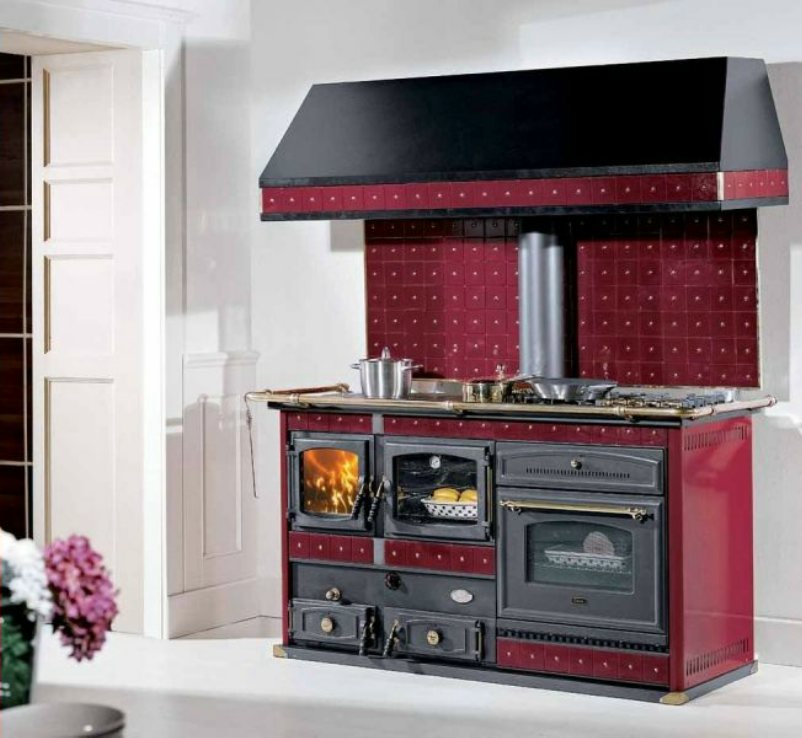 Облицовка кухонной дровяной плиты может быть самой разной: от дорогой майолики до полированной стали или искусственного/натурального камня.