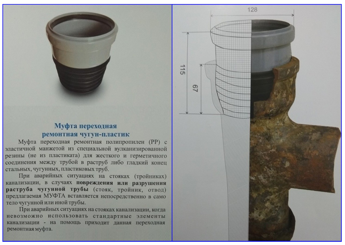 В торговой сети имеются переходные ремонтные муфты со встроенными манжетами и раструбом, с помощью которых соединяются чугунные коллекторы и полимерные трубопроводы. При использовании этого фасонного элемента хомут вставляется в чугунный патрубок, а с другой стороны к переходнику подсоединяется гладкостенная труба из ПВХ.