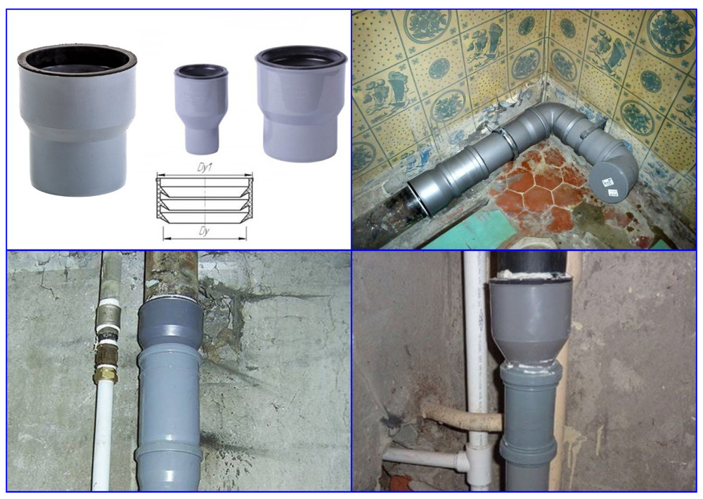Редукционные суставы. В торговых сетях продается большое количество переходников с чугунной трубы на пластиковую, размеры которой составляют 110 на 123 (124) мм. Они представляют собой втулку, на одной стороне которой расположен увеличенный раструб на 123 мм с внутренней резиновой прокладкой, а противоположная труба имеет окружность 110 мм для подключения к трубе из ПВХ. При установке на чугунную трубу вставляется переходник с внутренней резиновой прокладкой (имеет особую форму в виде браслета с лепестками), а второй конец вставляется в раструб 110 ПВХ.