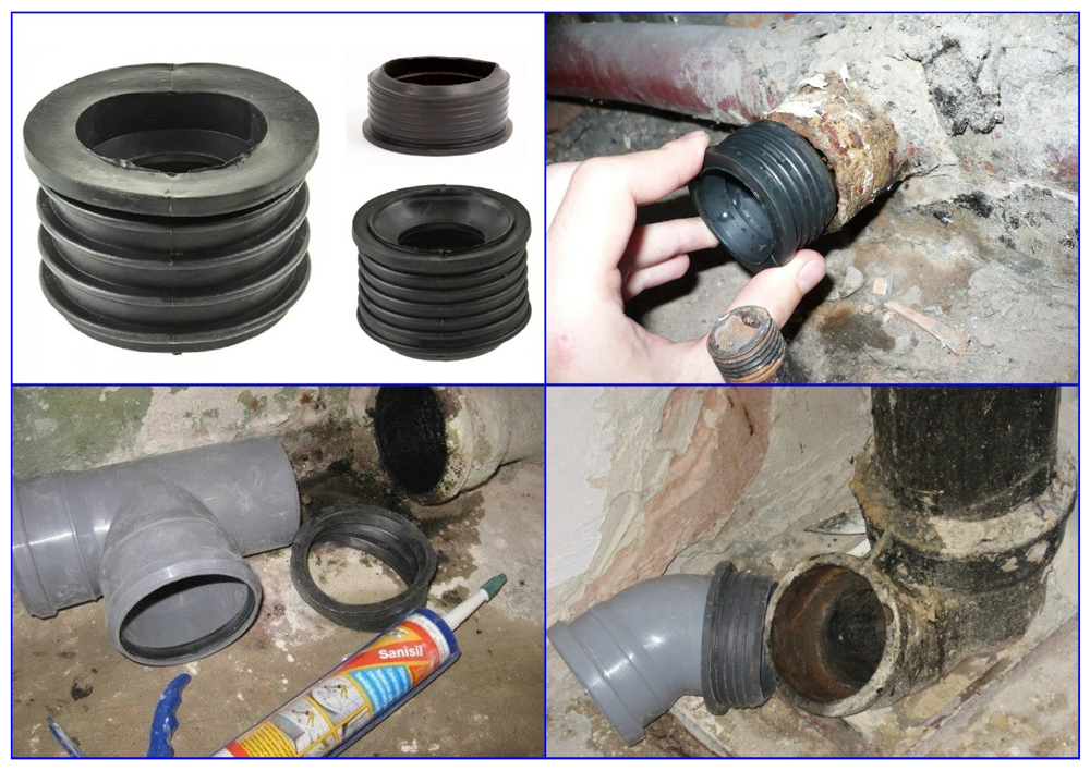 - Резиновые уплотнители и силиконовый герметик. В первую очередь устанавливается гибкий переходник. Затем в раструб заводится пластиковая труба, и щель заполняется силиконовым герметиком. Принцип использования этих материалов описан выше. В данном случае технологии объединяются, но монтаж выполняется поэтапно.