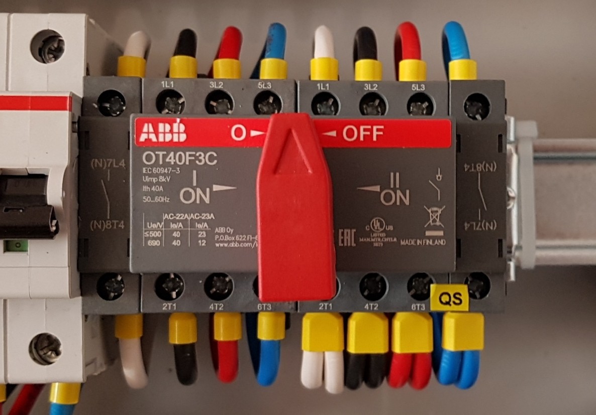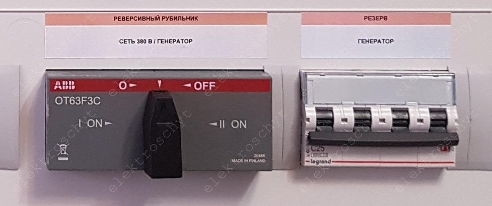 Т.к. электрощиты я в основном собираю на комплектующих АВВ, то и реверсивный перекидной рубильник я тоже использую их производства. Но бывает, что ставлю и другие переключатели, например, “ручной ввод резерва” от Legrand и переключатели-рубильники SFT от Hager, но об этом напишу в отдельных статьях.