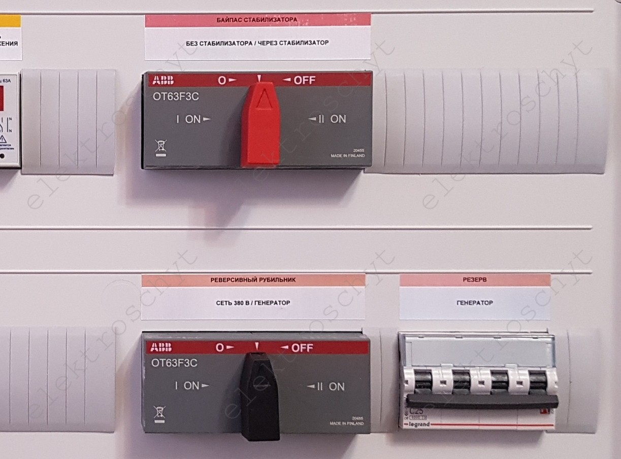 Периодически использую реверсивный рубильник и для организации байпаса для стабилизаторов, подключенных в схему электрощита. В одном положении идет питание электросети частного дома через стабилизаторы, во втором положении – без стабилизаторов.