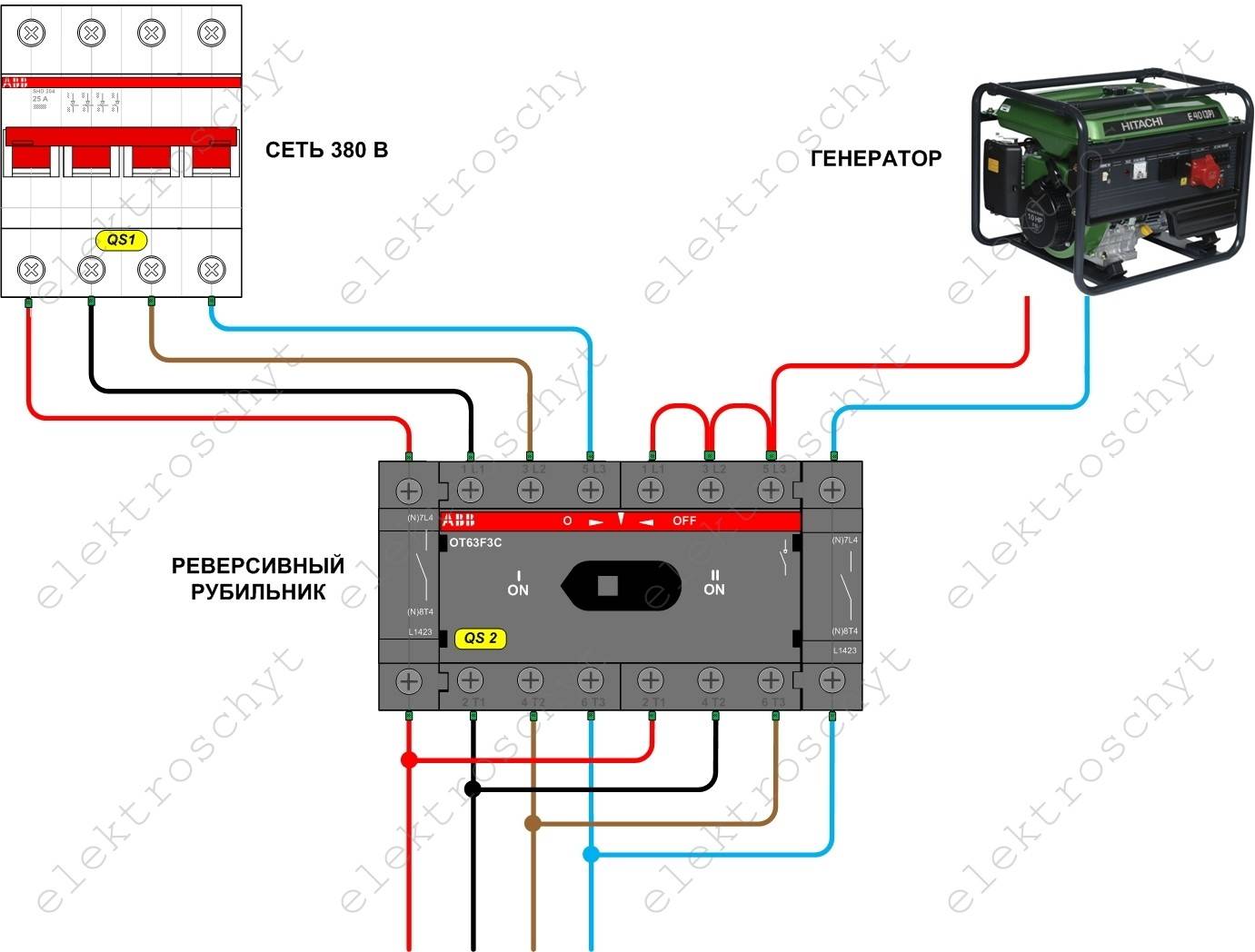 Реверсивный рубильник или переключатель в бытовых электросетях, как правило служит для подключения резервного питания. Это могут быть бензиновые и дизельные генераторы, а также, например, подключение второго источника электричества от другой ЛЭП для надежности электроснабжения частного дома. Переключение производится механически в ручном режиме, не путайте с АВР (автоматическое включение резерва).