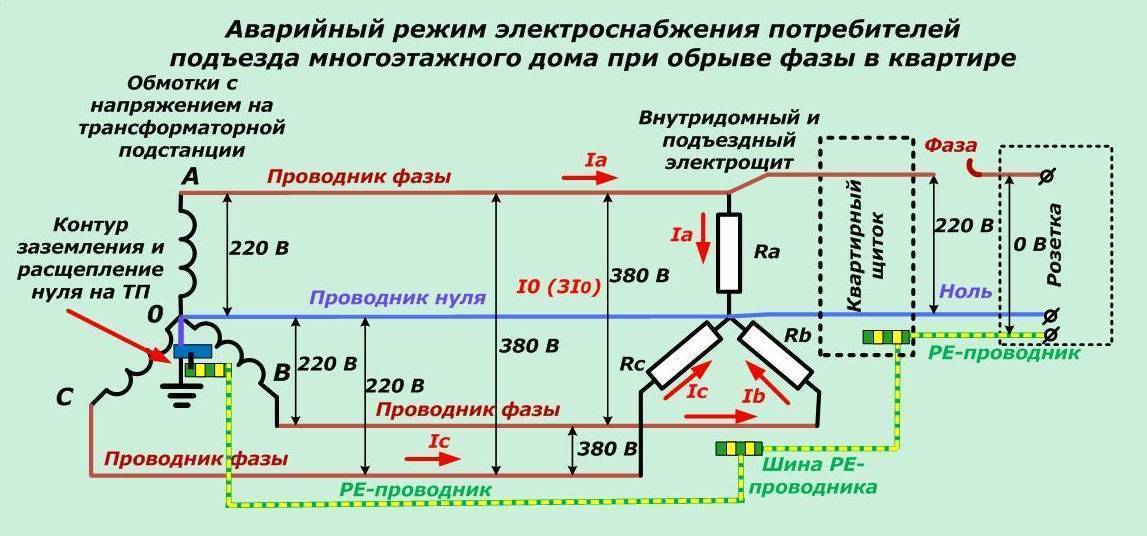 Так, например, не исключено «отгорание» нейтрального проводника на электроподстанции или в силовом распределительном щите, обрыв жилы в электрическом кабеле и др. Когда нулевой проводник не надежно закреплен, то он нагревается, окисляется и в конечном итоге перегорает.