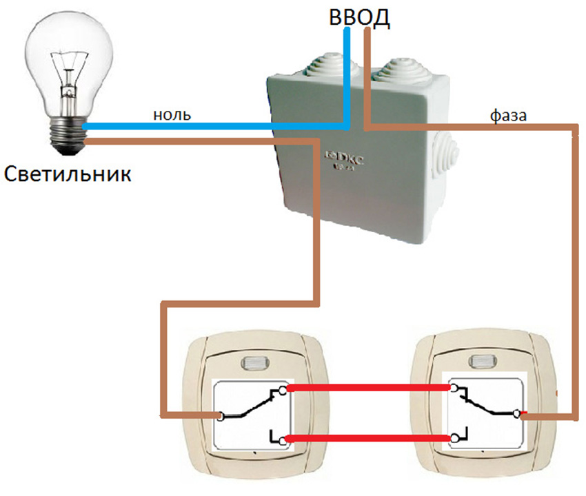 При использовании проходных выключателей провод с фазой нужно подключать к двум выключателям, соединённых друг с другом проводом, а нулевой провод подключается к осветительному прибору. При замыкании двух контактов на двух двухклавишных выключателях цепь замыкается и на лампочку начинает поступать ток. Для размыкания цепи достаточно нажать на клавишу любого выключателя.