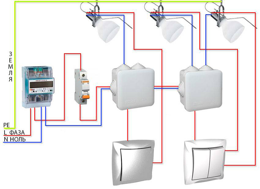 - Ноль и земля подаются напрямую без выключателей сразу на лампочки