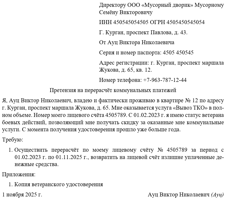 Ниже по документу отмечаем, что заявитель является собственником жилого помещения, по которому получатель претензии оказывает ему определённые коммунальные услуги: свет, тепло, вода, вывоз ТКО, уборка помещений и так далее. Далее по тексту укажем, что вы имеете право на перерасчёт по соответствующего основанию, прикладываем имеющиеся на руках подтверждающие документы.