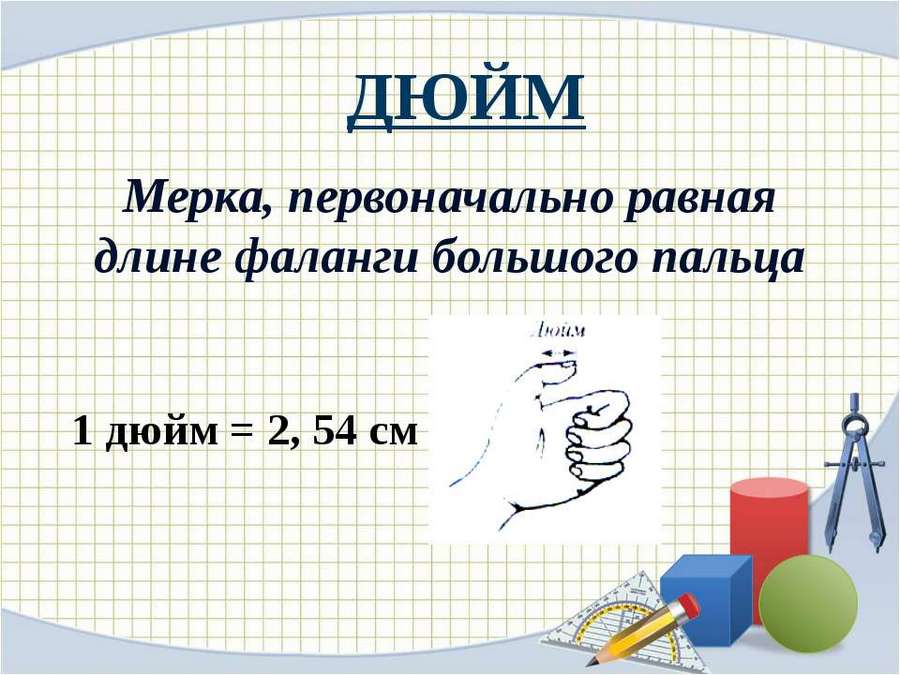 Слово «дюйм» имеет голландские корни. И в дословном переводе означает «большой палец». И по одной из версий изначально длиной 1 дюйма считали длину фаланги большого пальца у взрослого мужчины.
