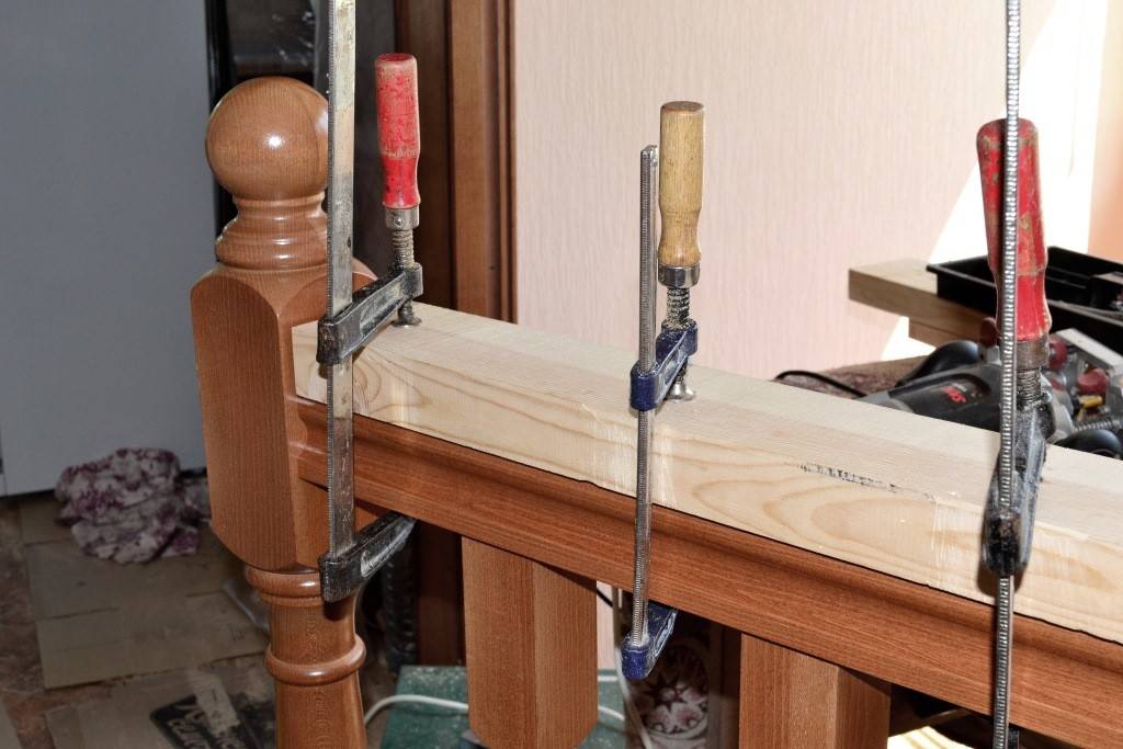 Приступая к изготовлению перил своими руками, необходимо обзавестись большим количеством электрического инструмента. Способ создания перил для лестничной конструкции очень простой. Если кратко описать принцип работы, то она заключается в наклеивании тонких досок друг на друга, используя клей ПВА, и последующая фрезерная обработка изделия под круглое сечение.