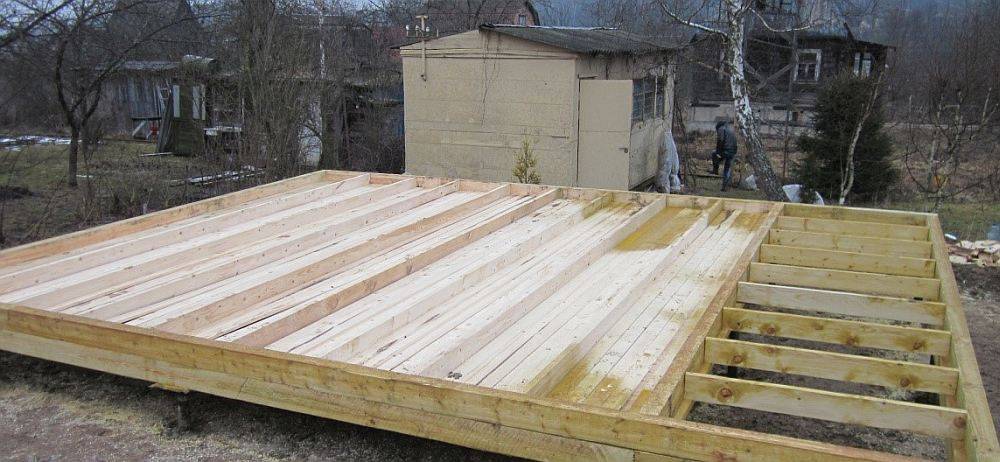 В основе всей конструкции лежат лаги, поэтому для их обустройства применяют брус с сечением 10х15 см или с сечением 15х20 см. Брус устанавливаем на ребро площадки сваи. Чем больше опор под лагами, тем меньшее сечение бруса можно применять, но специалисты не рекомендуют брус меньше 10х10 см.