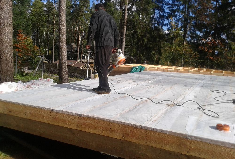 - гидроизоляцию и ветрозащиту – для этого настилается слой полиэтиленовой пленки, рубероида или современного изолирующего материала. Все стыки проклеиваются специальным скотчем;