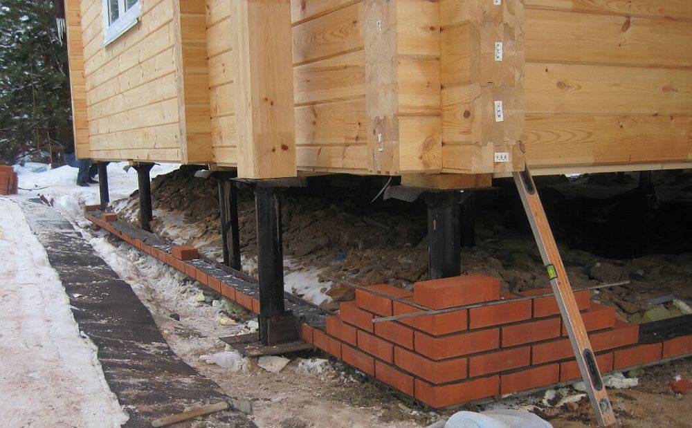 Первым этапом исследуется фундамент и проверяется, насколько он имеет ровный уровень. Для этого нужно измерить его высоту в разных частях и проверить диагонали. В случае обнаружения погрешностей их исправляют. Следом в фундаменте сверлятся отверстия и устанавливаются анкера для закрепления лежней. После проводится гидроизоляция фундамента с помощью мастики и специальной пленки.