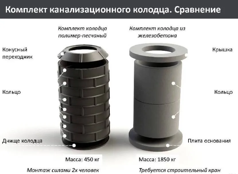 На строительном рынке реализуют еще один вид колец большого диаметра, из которых можно собирать канализационные колодцы, их изготавливают из композита, состоящего из полимера и песка. Полимерпесчаные кольца в отличие от бетонных имеют следующие особенности: