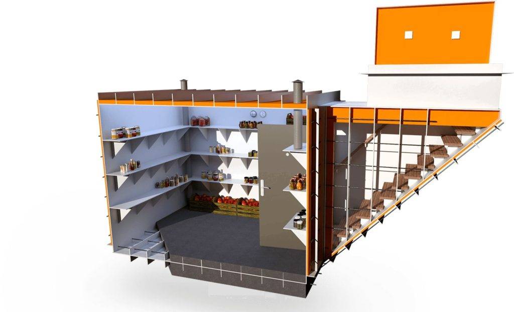 Отличное капиталовложение для небольшого коммерческого предприятия. В области бокового входа имеется вертикальная дверца размером 800х1800 мм. Это позволит проносить в погреб большие и громоздкие предметы без лишних хлопот. Также фирма предоставляет деревянную лестницу, которая оснащена поручнем и широкими ступеньками. Угол наклона оптимальный. За циркуляцию воздушных масс отвечает приточно-вытяжная вентиляция. Гигрометр позволяет отслеживать уровень влажности и температурный режим внутри конструкции. Для изготовления полочек применяется высокопрочный пищевой пластик.