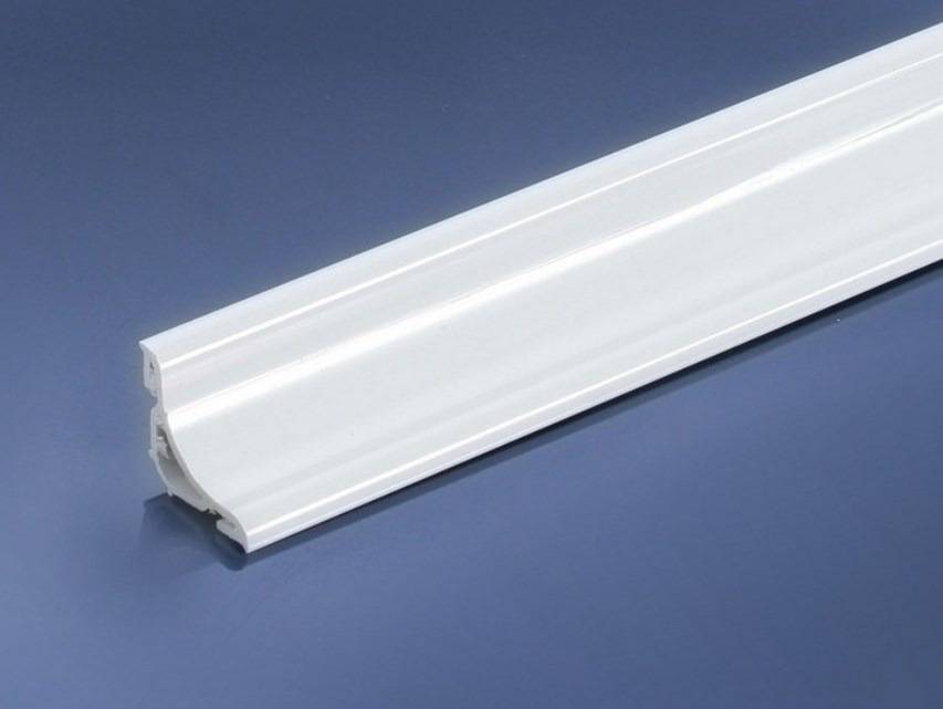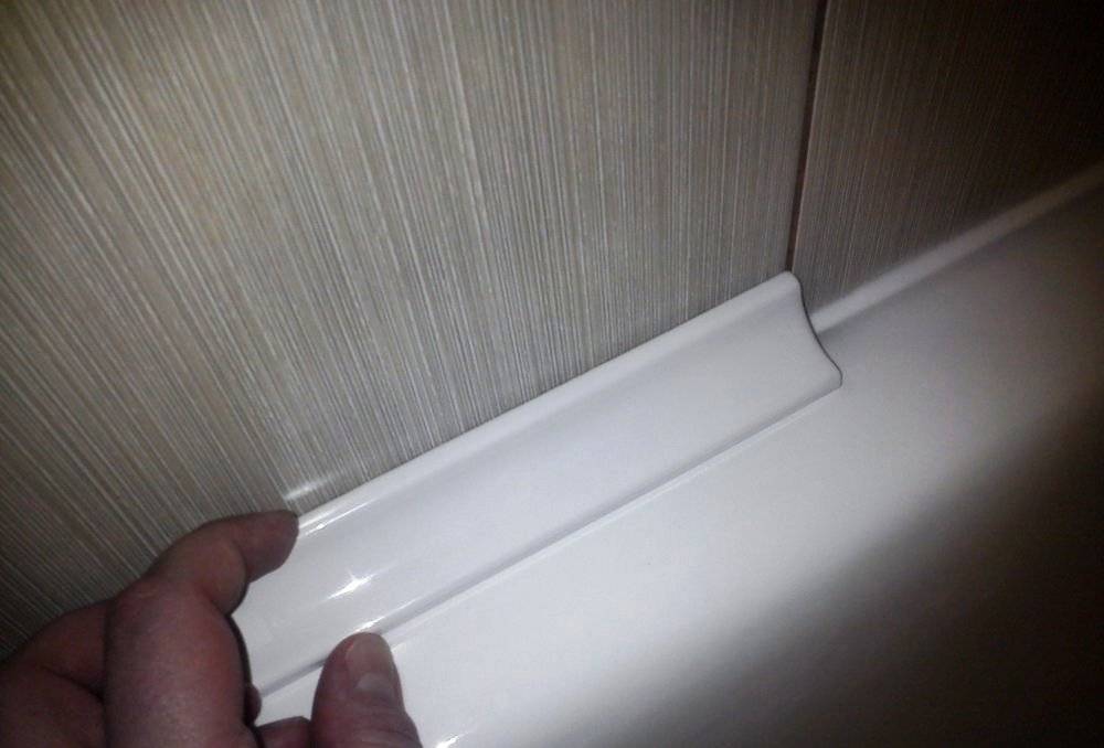 Плинтусы из ПВХ монтируют на стеновую отделку или под нее. Пластик хорошо клеится к окрашенной стене и другим поверхностям. Если полоса стоит под кафелем, демонтировать ванну без демонтажа плитки не получится.