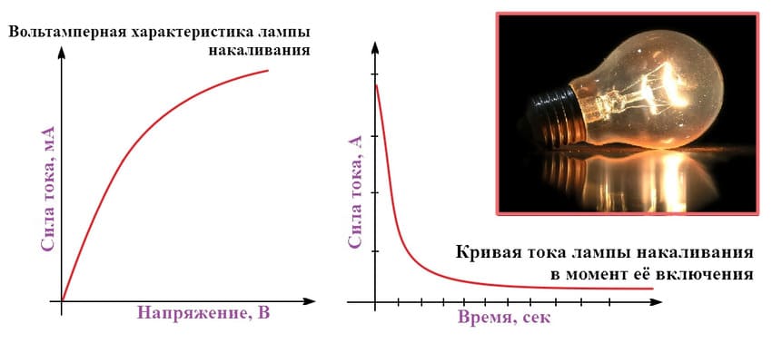 К примеру, лампа накаливания, мощностью 60 Вт, при комнатной температуре имеет сопротивление нити накала около 60 Ом. При включении её в сеть, напряжением 230В, в начальный момент ток через нить накала будет составлять: