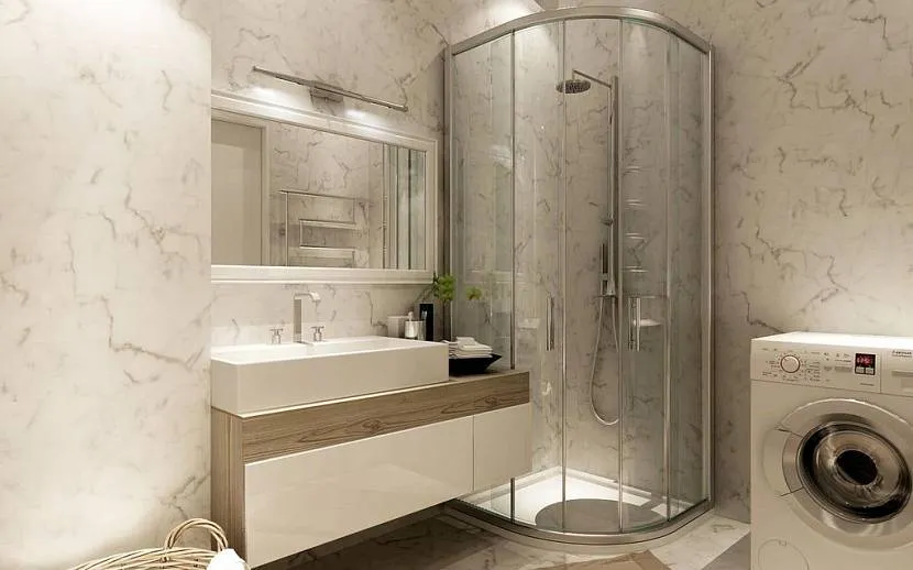 - Душевая. Приобретите готовую или сделайте сами, создав подиум и облицевав его стеклянными или пластиковыми панелями. Предпочтя ванную с душевой кабиной 3 кв м вы выиграете место на дополнительные зоны хранения или технику. Но не экономьте на размере: в кабине меньше 800*800 взрослому средней комплекции будет некомфортно.