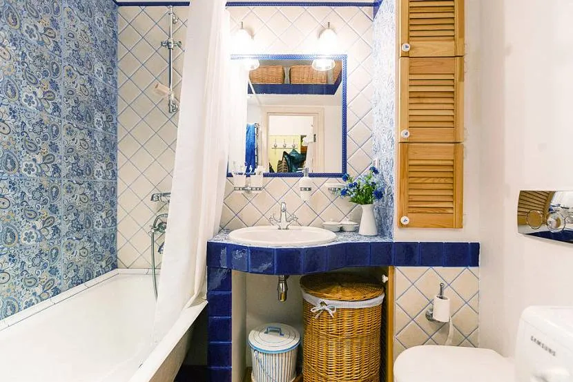 Но есть интересный вариант выбрать пеструю плитку, или яркую и насыщенную для “выравнивания” планировочных изъянов – лишних углов, ниш, конструкционных элементов стен, и комбинировать ее с натуральными эко-тонами, ненасыщенными цветами!