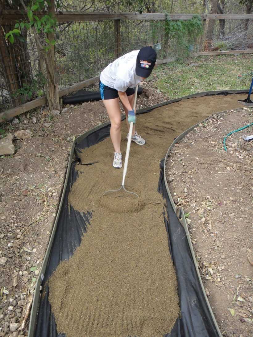- Всыпать слой гравия, затем песка (песчаная подушка). Увлажнить и хорошо утрамбовать (например, с помощью ручного утрамбовщика грунта), чтобы убрать проседания.