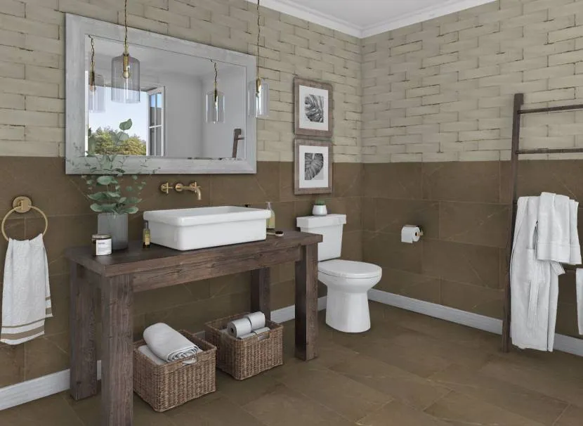 - Керамогранит. Керамогранит — прочный композитный материал, имитирующий цвет и фактуру натурального камня или дерева. При его производстве смешиваются белая глина, полевой шпат, песок и минеральные красители. Обжиг керамогранита происходит при температуре 1300 градусов. Керамогранит не впитывает влагу, обладает высокой стойкостью к истиранию и ударам. Для санузлов лучше выбирать керамогранит с антискользящим покрытием.