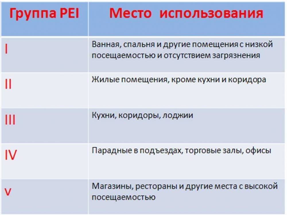 По данному признаку плитка делится на несколько классов, обозначающихся римскими цифрами. Для бытовых условий подходит материал I – III классов.