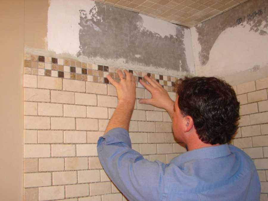 верхняя полоса темного кафеля, которая находится под потолком, должна состоять из одного или полутора рядов кафеля.