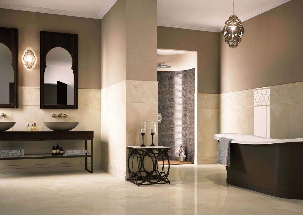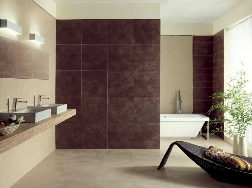 Стиль для просторных ванных комнат с использованием керамической плитки или натурального камня. Цвета стен бежевый, песочный, пол шоколадный, терракотовый.