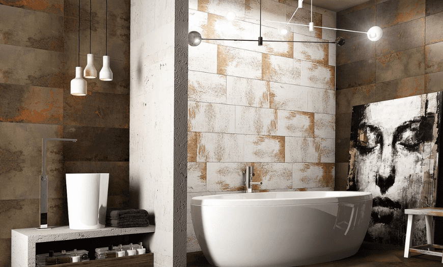 В современном хай-тек направлении используются глянцевые плиточные модели, зеркала, изделия под металл, которые могут создать разную игру контрастов. Городской стиль лофта отличается отделкой в холодных тонах, имеющей более грубую фактуру или имитацию кожи или кирпича. Для ванной комнаты, оформленной в направлении минимализма, выбирайте покрытие одного или максимум двух цветов, отличающееся простыми и строгими формами.