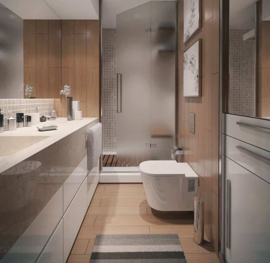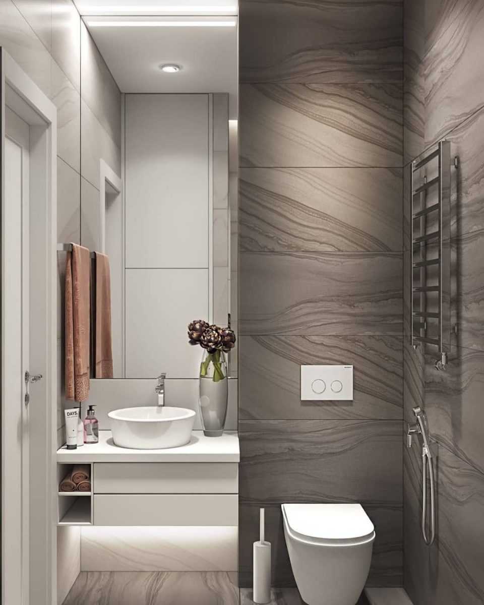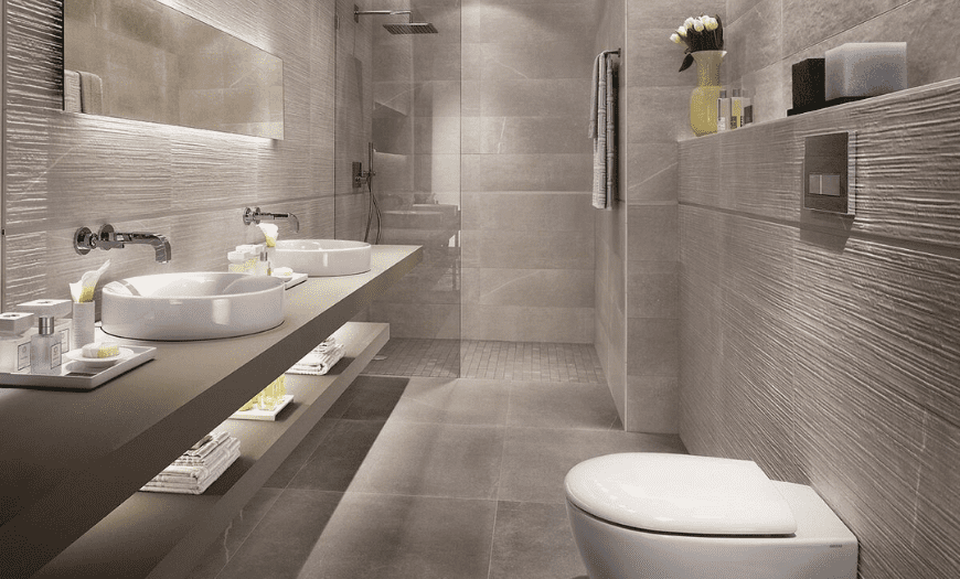 Прямые и чистые линии, отсутствие громоздкости, лишних элементов декора, продуманное пространство для хранения вещей — отличительные черты современности. Чтобы воплотить этот стиль в ванной, выбирайте плитку серого, металлического, коричневого цвета.