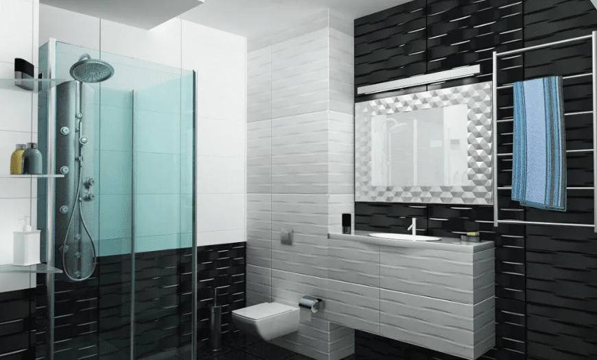 А вот привлекать третий цвет к отделке – большой риск. Если хочется разбавить двухцветный союз, сделайте это за счет текстиля или даже растения, которому подойдут условия санузла.