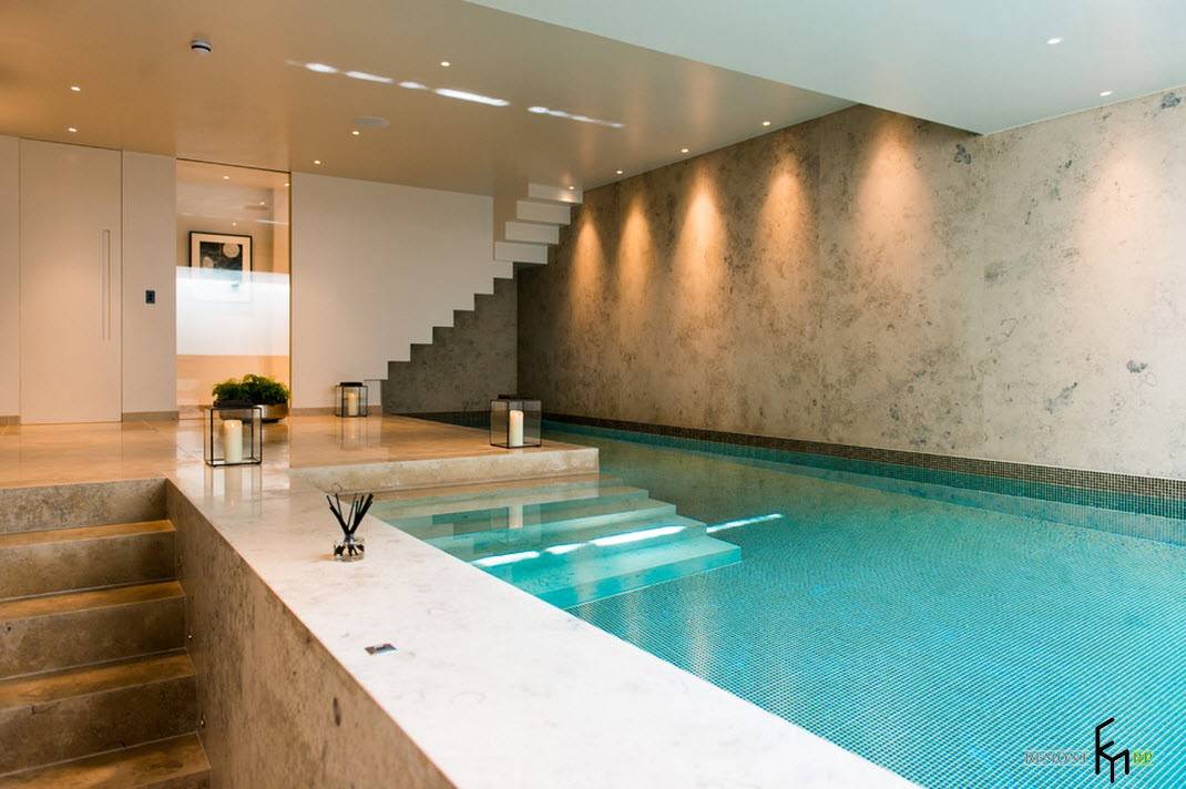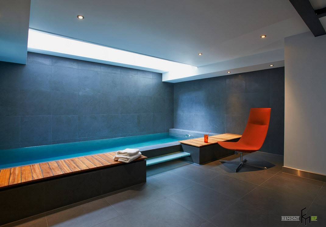 При дизайне пола лучше использовать плитку или керамогранит. Современная тенденция в дизайне – деревянное покрытие, но это не слишком практично. В помещении, в котором находится бассейн, высокая влажность воздуха, а теплый пол будет его подсушивать. Еще одно его преимущество – возможность ходить босиком в независимости от функционирования системы отопления.