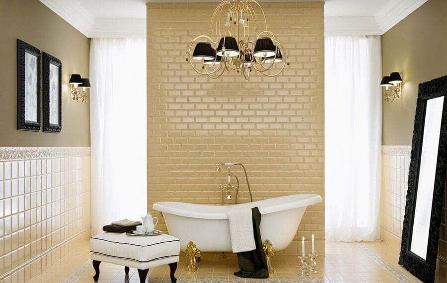 Плитка, имитирующая кирпич, лучше всего подойдет для отделки пола в ванной комнате или нижней части стен (если вести речь об английском стиле). К примеру, отлично будут сочетаться кабанчик, покрывающий нижнюю треть стен, и шахматная кладка пола в оригинальной цветовой гамме. Роскошно будет смотреться пол, выложенный плиткой «кабанчик» в нежном цвете «кофе с молоком» в сочетании с белой затиркой. При этом стены можно выложить плиткой с узором в виде цветов, или обшить качественным деревом, а вдоль плинтуса пройтись небольшой лепниной.