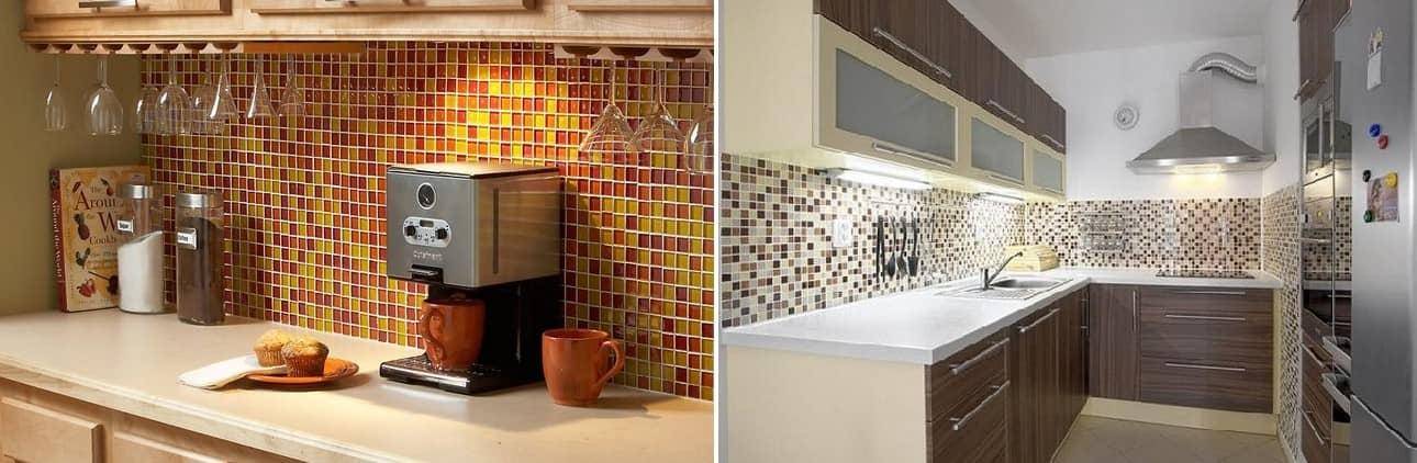 - из мозаики, но для кухни такой вариант менее предпочтителен, так как получается много затираемых швов, которые подвергаются воздействию горячего воздуха и жира, а также требуют частой уборки;