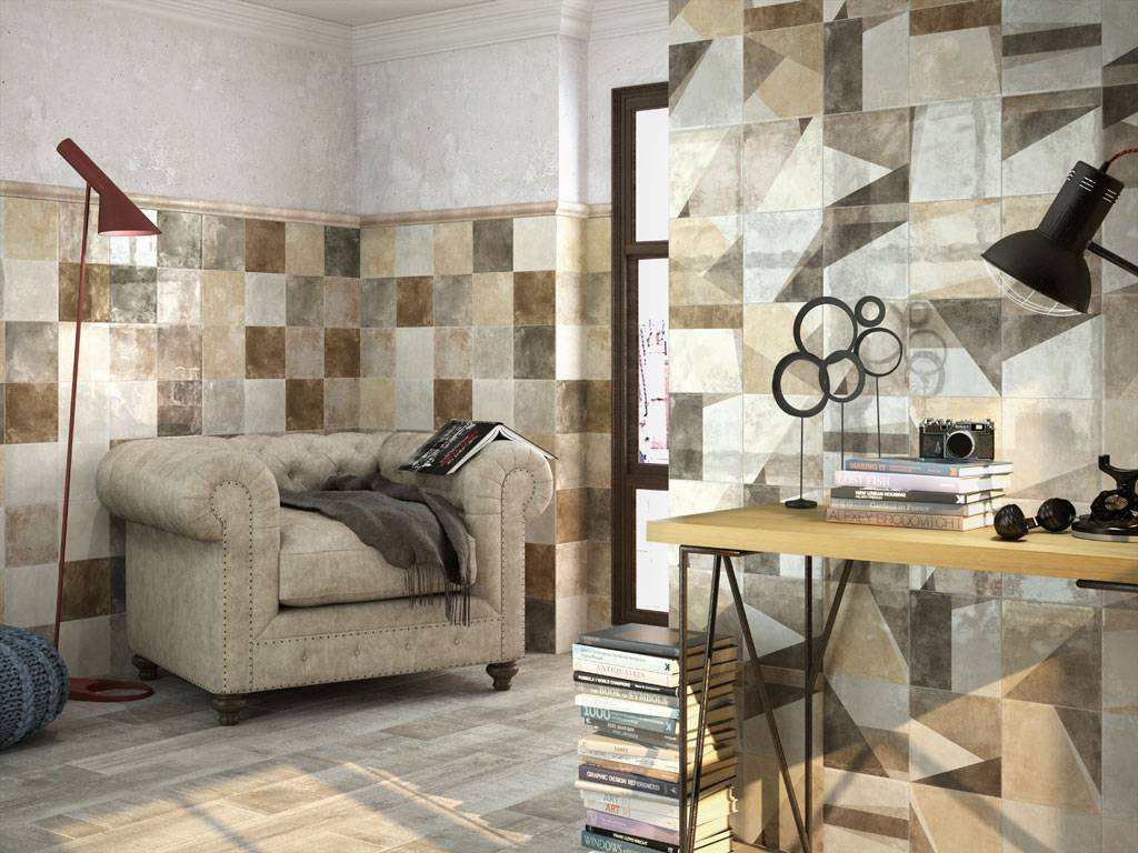 Плиты с эффектами состаривания и приглушенными оттенками оригинально смотрятся в разных типах интерьера.