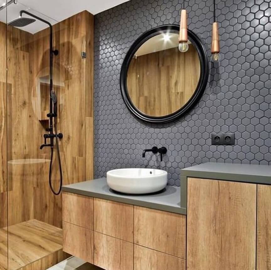 Броские элементы декора гармонично и стильно выделяются на нейтральном фоне. Обилие смелых цветовых решений в одних аксессуарах позволит оживить пространство, и при этом нет необходимости в новом ремонте. Серая ванная комната с деревом, особенно темных пород или имитацией имеет особый ореол тепла и спокойствия. Причем если присутствуют только деревянные детали, они также выглядят ярко.